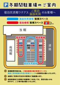 冬期間中、深夜から早朝にかけて除雪作業を行う為、上の図のように宿泊の方の駐車スペースと施設利用の方の駐車スペースを分けることになりました。